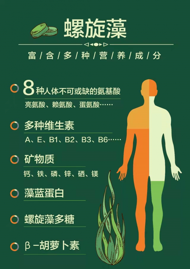 除了高含量的优质蛋白质,螺旋藻还富含如藻蓝蛋白、B胡萝卜素、藻类多糖等多种生理活性物质。国内外大量临床医学研究证明:天然螺旋藻的藻蓝蛋白具有突出的抗氧化和抗炎活性, 能有效抑制各种炎症引起的疾病;而藻多糖具有抗氧化、增强人体免疫的功能,可以提高机体对疾病的防御能力;而高含量的β-胡萝卜素和B族维生素具有抗氧化、抗疲劳、抗衰老的作用;而其ω系的不饱和脂肪酸类,更具有减低胆固醇和高血脂的功效。