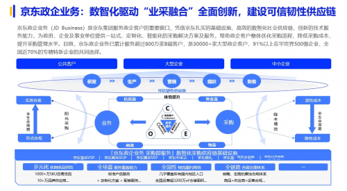 京东政企业务创新性提炼的服务经营(Operations)、服务职工(Employees)、服务客户(Customers)的“OEC”价值模型,能够推进信息流、商流、物流和资金流“四流合一”,实现采购与研发、生产、营销、组织、财务的“五大融合”,推动采购向全方位服务转型,助力政企客户实现业采融合全面落地。