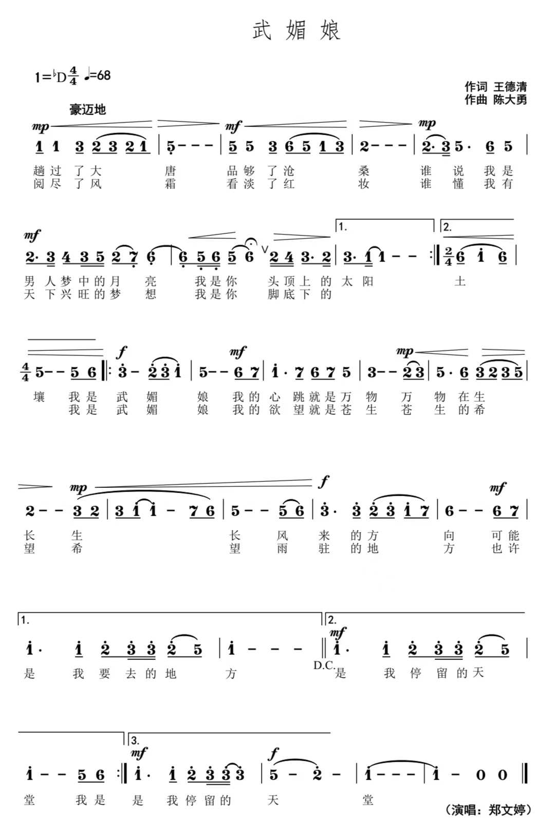 歌曲《武媚娘》由国内音乐专业艺术团队联手打造,该作品以独特视角诠释中国历史上唯一女皇的传奇人生,由四川电影电视学院音乐学院青年作曲家陈大勇作曲,青年歌唱家郑文婷演唱;中国音乐金钟奖得主王德清作词,执笔以颠覆性音乐叙事再现中国历史上唯一女皇的精神图谱。