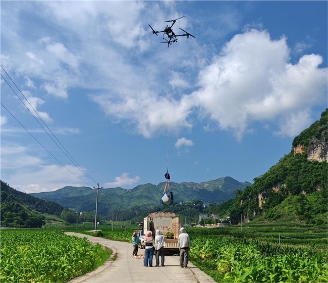 (烟农使用无人机吊运烟叶。黄益民/摄)