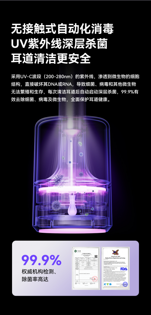 西圣这次带来的FindX还新增了UV紫外线深层杀菌底座,使用耳勺后放回底座内,会自动开启UV紫外线深层杀菌,让耳勺表面的细菌、病毒和其他微生物无法繁殖和生存,真正做到了深层杀菌,除菌率高达99.9%。不管是自己使用还是全家使用都更加卫生健康!