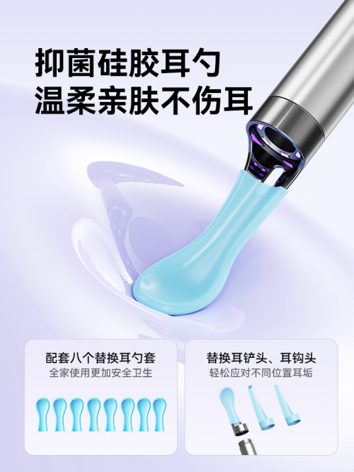 耳勺硅胶套采用柔软度更高的母婴级硅胶材质,触感更加温和亲肤,对宝宝娇嫩耳道更友好,使用更加安全不伤耳!还有配套的八个可替换耳勺套,以及替换的耳铲头和耳钩头,满足全家使用需求,以及轻松应对不同的掏耳需求!