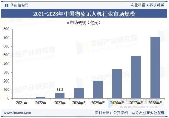 当前,中国低空经济正迎来高速发展期。随着电商和物流行业的快速发展,以及相关政策的支持和推动,我国物流无人机行业迎来了爆发式增长。据华经产业研究院报告显示,2023年中国物流无人机市场规模已达到61.3亿元,并预计未来几年将继续保持高速增长态势。其中,末端无人机市场规模占比较大。另据相关行业研究显示,2025年上半年无人机物流配送量同比激增286%,预计年底市场规模将突破960亿元,未来三年复合增长率将超过120%。