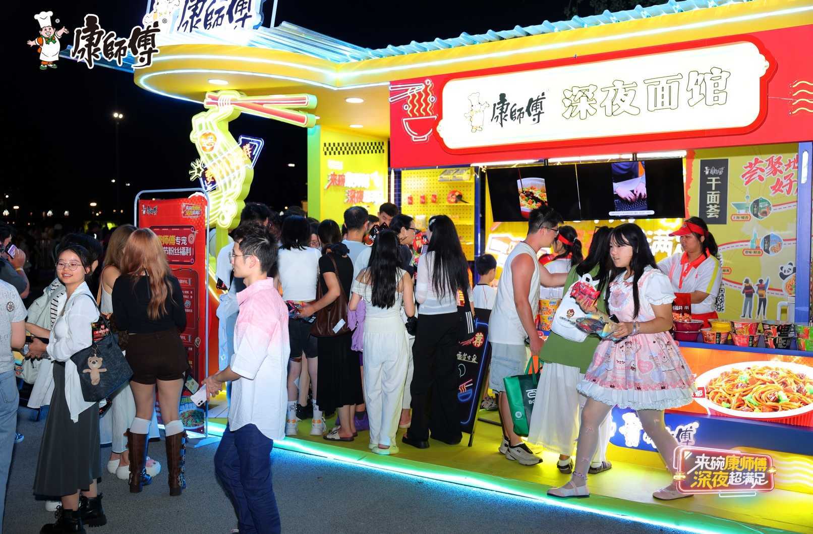 最后,在许多品牌大举占据线上渠道时,康师傅也没有落下线下创造“情绪价值”的机会。在鲜Q面上市时,品牌曾举办“一日店长”活动,把线下打造成了春日约会地,大批粉丝到场应援,创造了"视觉、味觉、情感"的三维沉浸体验;近期,康师傅把“深夜面馆”开到了各地,在深夜时分用一碗热面接住打工人的疲惫,延续了品牌的温暖陪伴感。不仅如此,康师傅还敏锐洞察年轻消费者需求,在泡面之外寻找答案,让深夜面馆再添健康新滋味——康师傅与伊利组成的“深夜搭子”,两大国民品牌联手,将伊利泡面芝士条加入康师傅经典口味当中,引发年轻消费者的打卡和热烈追捧。