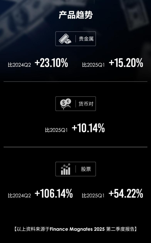 股票类:本季度表现最为突出,交易量同比飙升106.14%,环比增长54.22%。这反映出投资者对股票市场的兴趣显著回升,同时也强化了ATFX在支持多元化投资策略方面的重要作用。