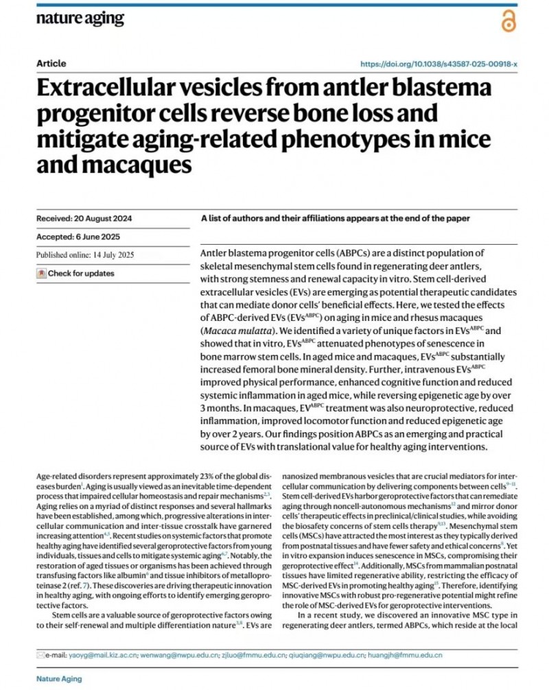 这一成果也发布在7月14日国际顶级期刊《Nature Aging》上,该研究首次发现,鹿角芽基祖细胞(ABPCs)来源的细胞外囊泡(EVsABPCs)具有强大的抗衰老和组织再生能力,可有效逆转小鼠和恒河猴的骨质流失,并全面改善多器官衰老相关表型,为人类抗衰老干预提供了全新治疗策略及潜在的“年轻化”调控因子。