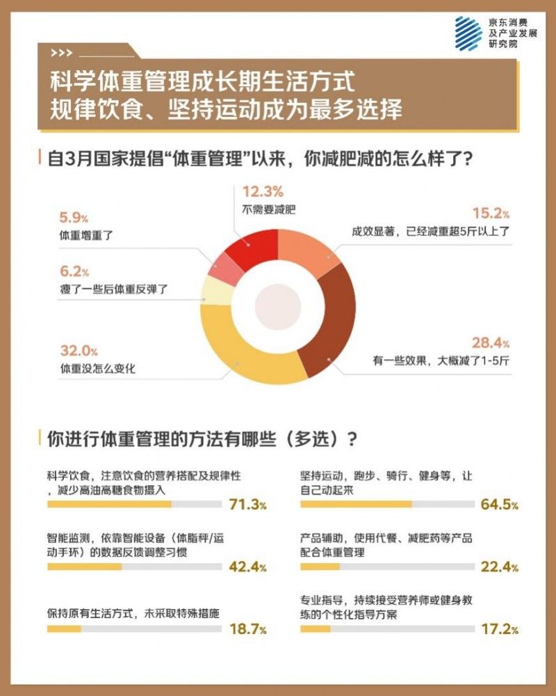 自3月份国家提倡体重管理以来,全民积极响应,3个月过去后,大家的行动效果怎么样?调研显示,32%的人体重维稳,28.4%的人略有减重效果,还有15.2%成绩明显,已经减重5斤以上。程序员赵凯曾因熬夜加班体重飙升至180斤,年初体检后下定决心管理体重,他没有盲目节食,而是坚持三餐定时、荤素搭配,每晚下班后去公园跑步40分钟,同时用运动手环监测心率和睡眠,半年下来成功减重12斤,他的秘诀是“不追求速度,找到能长期坚持的方法比什么都重要”。