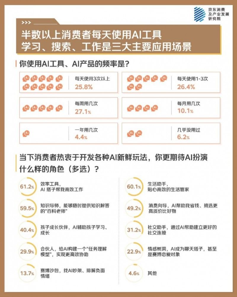 对于未来,消费者不再满足于让AI当个“工具人”,而是热衷于开发各种新鲜玩法,61.2%的人期待AI扮演效率工具的角色,60.1%期待其作为生活助手,59.5%渴望AI能够随时提供知识解答。除了各种功能,也期待AI展露出温情的一面,成为聊天搭子甚至是赛博恋爱对象。00后大学生睿睿认为AI不是冰冷的代码,可以是充满温度的陪伴,“它会无条件鼓励我夸赞我,有问有答,有求必应” 。