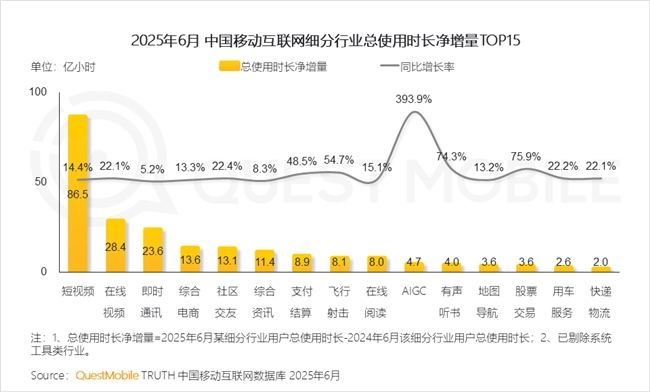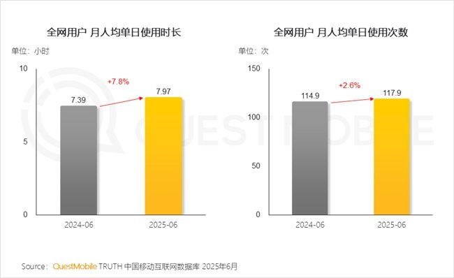 QuestMobile数据显示,2025年6月,全网用户月人均单日使用时长及次数分别为7.97小时和117.9次,较去年同期分别提升7.8%、2.6%,用户粘性加深。