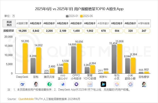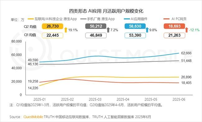 QuestMobile数据显示,2025年Q2,互联网/AI科技企业原生App月均用户规模2.67亿,相较Q1增长19.1%。