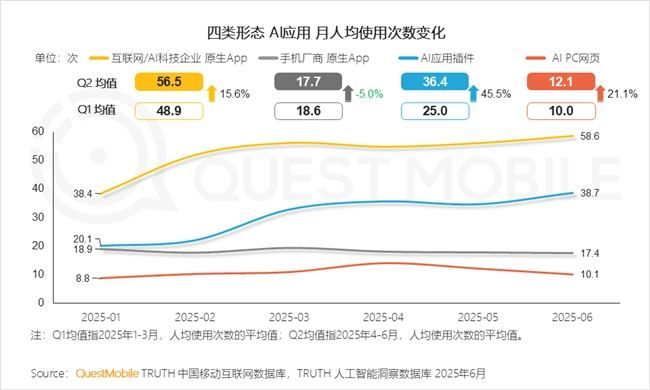 QuestMobile数据显示,2025年6月互联网/AI科技企业原生App人均使用次数最高达58.6次,剩下依次是AI应用插件(In-App AI),手机厂商原生App,PC端网页应用。