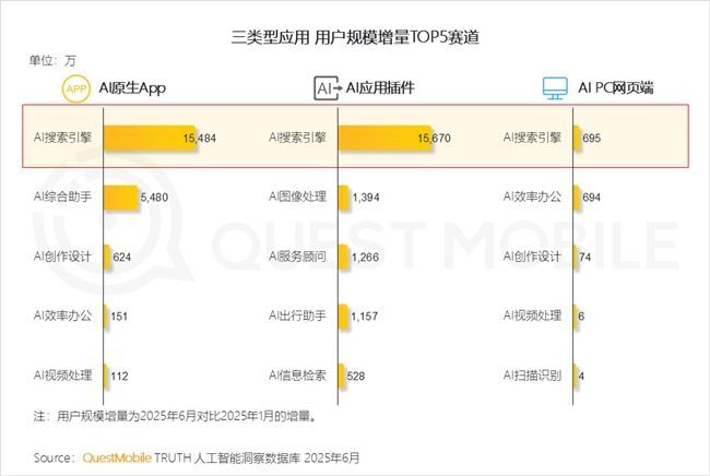 2.6 回顾2025上半年各赛道发展情况,无论哪种应用类型,AI搜索引擎赛道规模增量均最大,无疑为上半年的“黑马赛道”