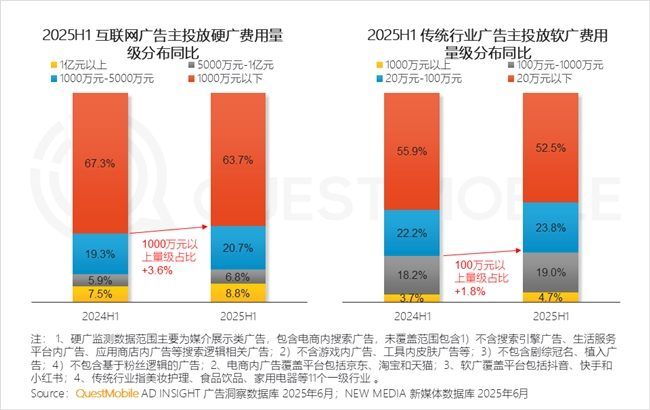 QuestMobile数据显示,2025年上半年,有互联网硬广投放的品牌中,约有36.3%的品牌投放规模超过1000万元,较去年同期增加3.6个百分点;在软广投放方面,虽然整体规模相对硬广较低,但是同样呈现广告主营销意愿增强的特征,以传统行业广告主为例,投放软广规模超过100万元的品牌数量占比增加1.8个百分点,达到23.7%。