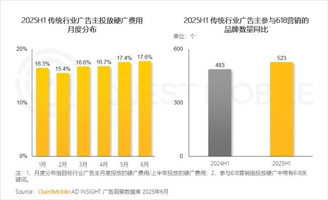 QuestMobile数据显示,2025年6月,传统行业广告主投放广告费用占上半年整体投放的17.6%,为投放规模最高的月份。