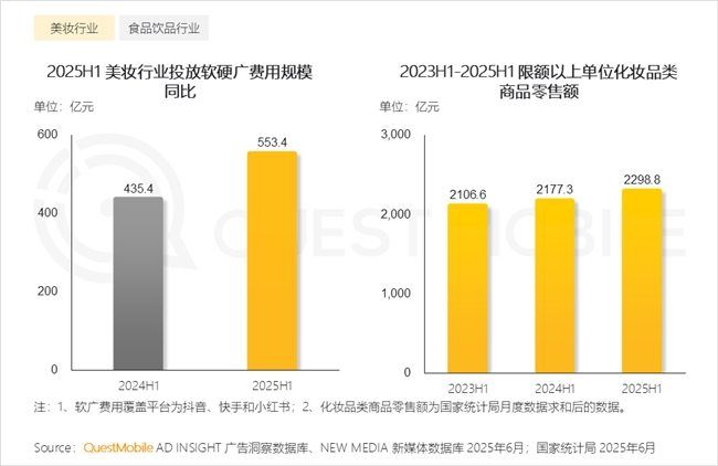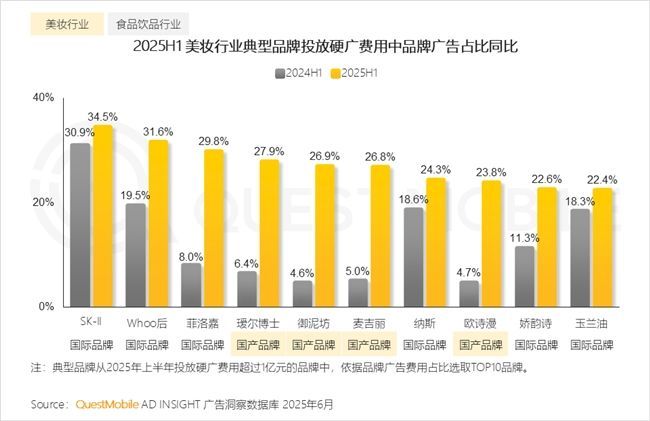 QuestMobile数据显示,2025年上半年,美妆行业投放硬广中品牌广告占比为7.4%,较去年同期提升1.7个百分点。