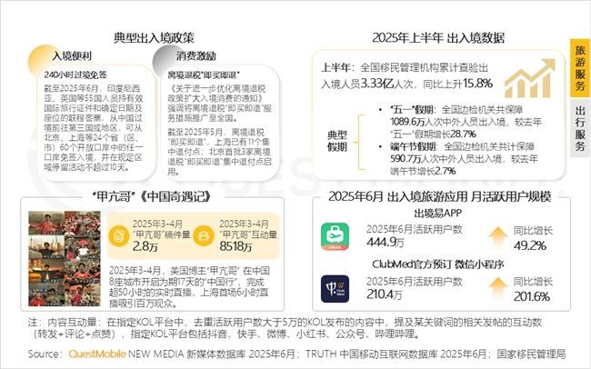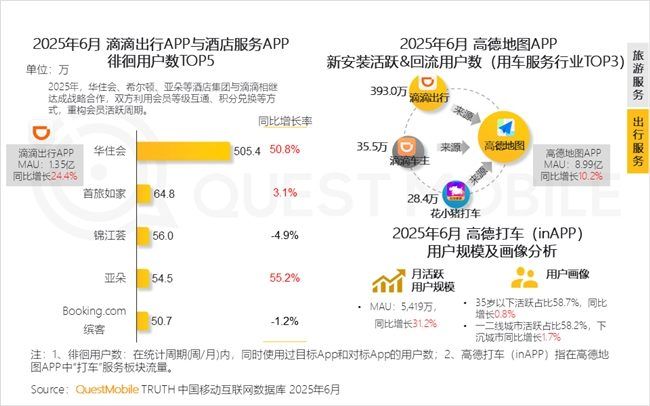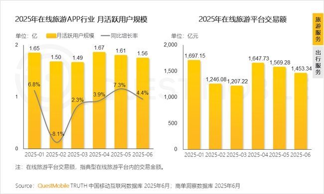 QuestMobile数据显示,2025年6月,旅游出行细分行业增速方面,用车服务和航班服务APP行业同比增幅均超20%,成为增长最快的细分行业。