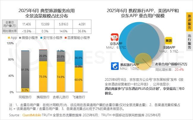 QuestMobile数据显示,2025年6月,携程旅行APP、美团APP、京东APP三者重合用户规模达6521万,同比增长20.4%。