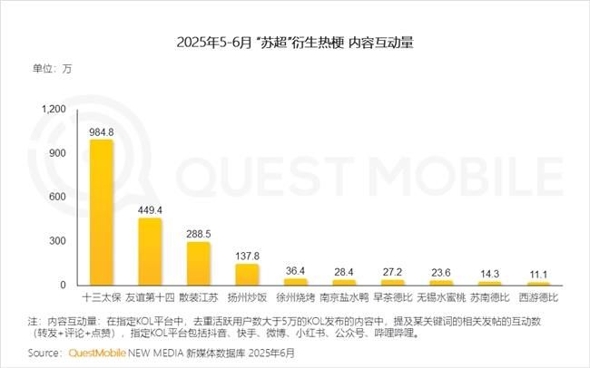 QuestMobile数据显示,2025年6月“苏超”全网互动量高达1.04亿,环比增长4225.4%。