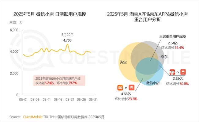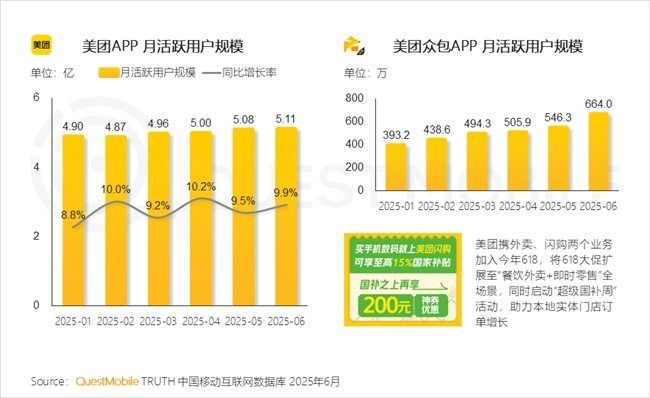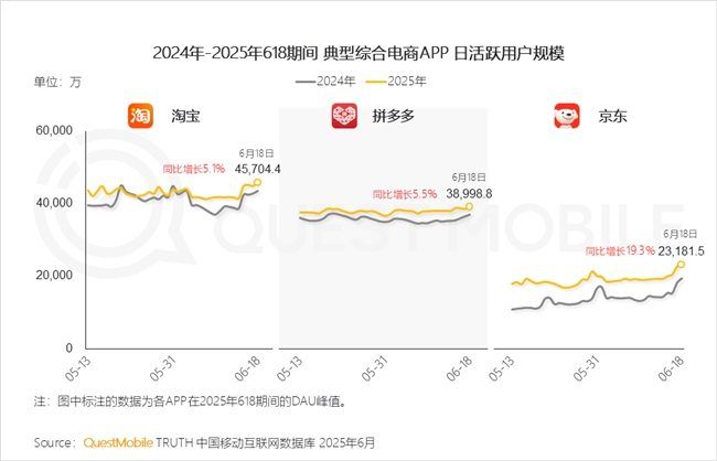 QuestMobile数据显示,截止2025年6月,淘宝、京东、美团APP日均活跃用户规模分别提升7.3%、33.2%和18.2%,三者月度重合用户规模已达3.88亿,较去年同期增长22.8%。