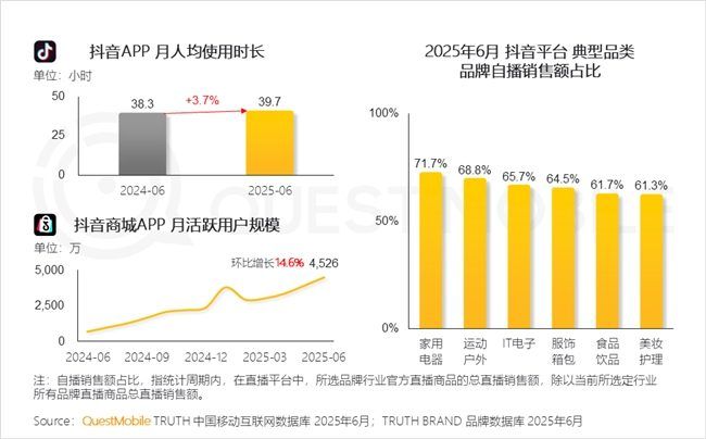 Ⅲ. 电商直播拉动抖音用户观看时长显著增长,品牌自播常态化,多个品类自播销售额占比超6成,同时货架场消费持续升温,带动抖音商城流量环比大幅提升