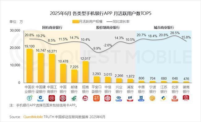 Ⅳ. 国有大行手机银行用户规模优势进一步凸显、农业银行流量达到1.9亿,部分股份制银行流量增长承压,招商银行仍有超10%的同比增长,河南、江浙、北京地区城市商业银行流量位居前列