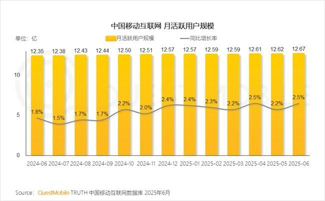 1.2 移动互联网大盘流量仍在稳步提升中,上半年增速保持在2.0%以上,截止2025年6月,全网月活跃用户规模已达12.67亿