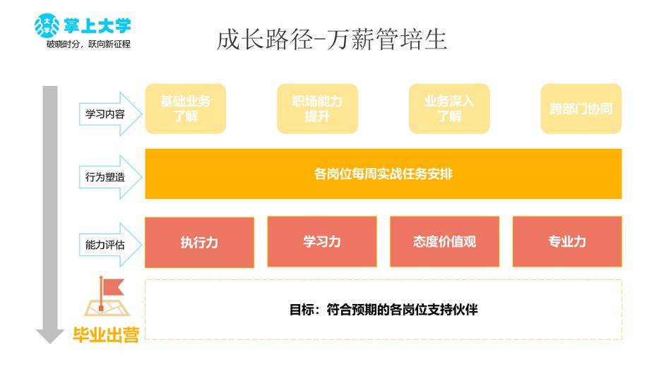 在此背景下,掌大开学营—“破晓者・暑期训练计划” 开营。该计划聚焦于万薪 offer 管培生、城市 TL、储备大区长等关键岗位人才的培养,通过为期四周的高强度集训,助力 40 位精英学员实现能力的跨越式提升。训练体系设计紧密贴合业务实际,第一周的 “业务基因解码”,让学员深入剖析公司沉淀十余年的校园渠道运营秘籍,精准掌握从商家入驻到用户转化的每一个环节,为后续业务开展奠定坚实基础。第二周 “团队核能引爆”,培养0-1团队搭建能力,深入开展业务并着重解决团队在实际运营中面临的协同难题,通过模拟各类复杂业务冲突场景,锻炼学员在资源有限的情况下,精准拆解目标并高效执行的能力,提升团队整体作战效能,从而构建出团队成长激励体系模型。第三周 “策略风暴降临”,结合不同区域高校学生的消费特点与行为习惯,引导学员制定个性化的品代策略,帮助他们从单纯的执行者转变为具备创新思维的业务开拓者。最后一周的 “跨域协同跃迁”,则致力于打破市场、运营、供应链等部门间的协作壁垒,培养学员在复杂业务场景下整合各方资源的全局视野与统筹能力。