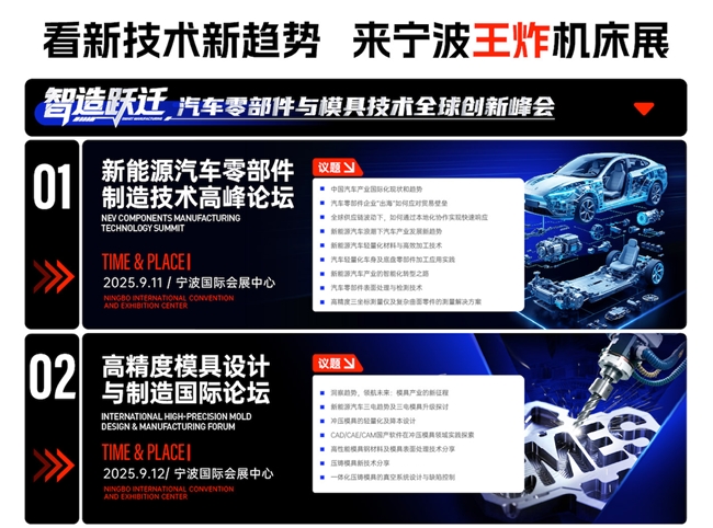 展会同期举办“智造跃迁·汽车零部件与模具技术全球创新峰会”,聚焦汽车零部件、模具制造核心主题,邀请中国汽车工业协会、博格华纳、吉利汽车研究院、宁波市模具行业协会、宁波市机床设备行业协会、浙江省模具行业协会、天正模具、力劲科技等30+协会代表、技术专家、企业高管等同台论道,直击汽车零部件全球化破局与模具精度0.01mm极限突破。