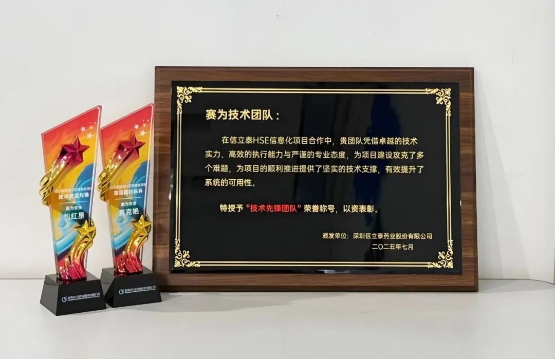 近日,赛为安全技术团队在董事长冯光福的率领下,应邀出席深圳信立泰药业股份有限公司(以下简称"信立泰")总部举行的HSE信息化项目成果总结表彰大会,并荣膺业主方授予的"技术先锋团队"称号。