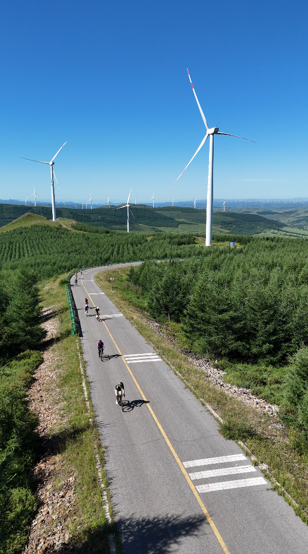 随着发令汽笛响起,骑行爱好者们应声出发,一路穿梭于草原与山脊之间,渐渐骑入草原天路,洁白的风车群在绿野蓝天下缓缓转动,与起伏的公路、辽阔的草甸共同绘就一幅现代能源与自然风光交融的壮美画卷,成为这条“最美天路”的标志性看点。赛事设置了三个不同组别:61公里的体验组、100公里的进阶组以及183公里的挑战组。选手们从崇礼庆典广场出发,途经草原天路、塔娜谷、布达拉观景台、塞北梯田、牧野星辰营地、断崖观景台等景点,不仅深度领略了草原天路的独特风貌,还实现了自我挑战与突破,生动诠释了人与自然和谐共处的美好理念。