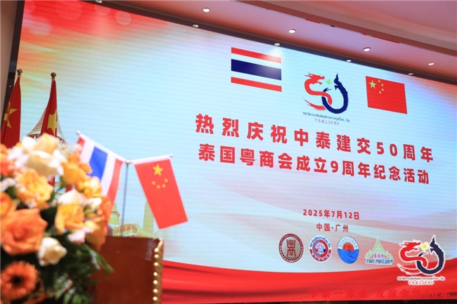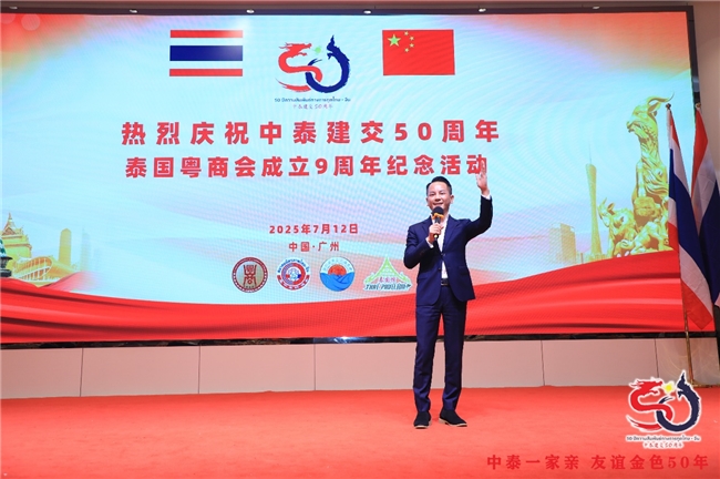 2025年7⽉12日下午5点在⼴州市天河区粤⼤⾦融城国际酒店隆重召开“庆祝中泰建交50周年暨泰国粤商会成立9周年纪念活动”,本次活动由泰中友好协会、泰国粤商会、国际潮商会⻓俱乐部联合主办。本次盛会以“中泰建交50周年暨泰国粤商会成⽴9周年”为主题,旨在携⼿泰商、粤商、潮商领袖,助推中泰两国⾼质量发展。