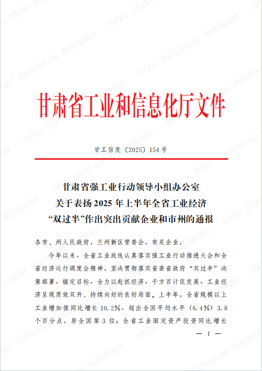 近日,甘肃省强工业行动领导小组办公室发布《关于表扬2025年上半年全省工业经济“双过半”作出突出贡献企业和市州的通报》(甘工信发〔2025〕154号),九江德福科技旗下子公司——甘肃德福新材料有限公司(以下简称“德福新材”)凭借在推动工业经济增长中的卓越贡献,荣登通报表扬企业名单。这一荣誉不仅是对德福新材上半年工作的权威认可,更标志着企业在甘肃新材料产业领域的标杆地位进一步凸显。