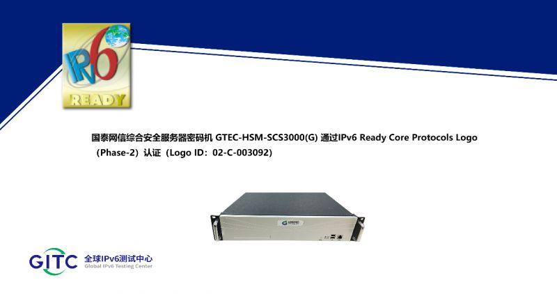 近日,北京国泰网信科技股份有限公司旗下综合安全服务器密码机GTEC-HSM-SCS3000(G)在下一代互联网国家工程中心-全球IPv6测试中心正式通过IPv6 Ready核心协议Phase-2测试,并荣获由国际组织IPv6 Forum颁发的IPv6 Ready Logo Phase-2认证证书(Logo ID:02-C-003092)。这标志着上述产品的IPv6核心协议实现已全面符合IETF RFC相关标准,其一致性和互通性得到了权威验证。