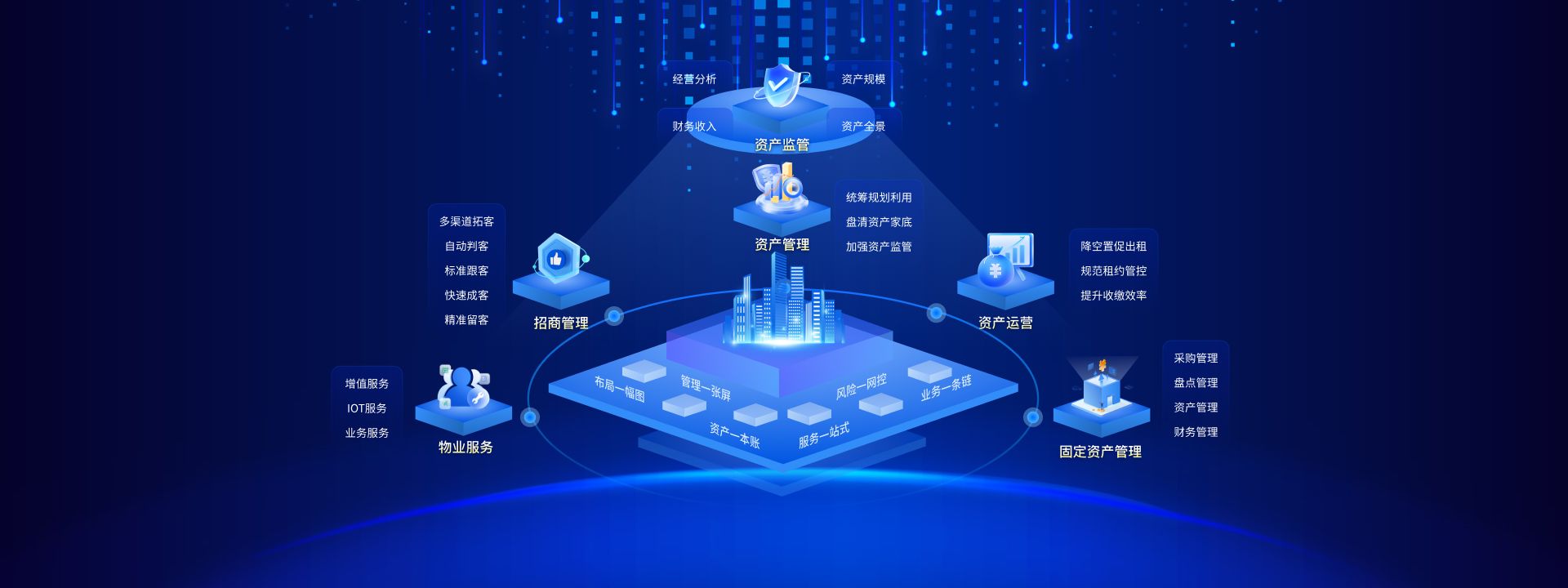 1.资管云 - 智能中枢: 实时掌控资产全景,智能预测价值潜力,精准预警运营风险,赋能科学投资决策。