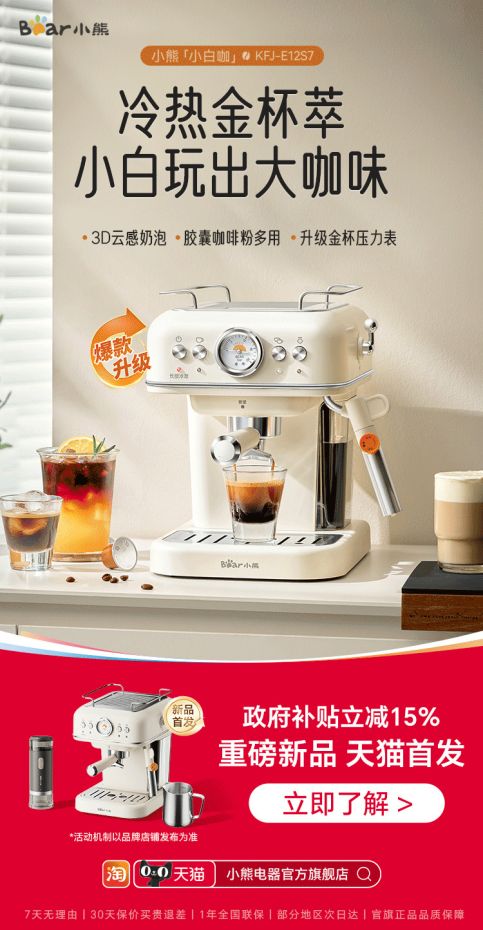 尽管喜爱咖啡的人越来越多,但对于咖啡小白而言,却常常因为复杂的器具选择和繁琐的步骤望而却步。小熊电器精准洞察这一痛点,推出“小白咖”咖啡机,并于天猫平台首发,让用户轻松体验手作的乐趣,实现咖啡自由。