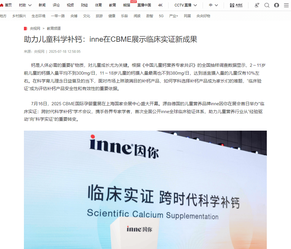 近日,源自德国的儿童营养品牌inne因你连续第三年亮相CBME国际孕婴童展,展会首日,inne与央视网联合举办的"临床实证:跨时代科学补钙"学术会议隆重召开,开创性地确立了"临床实证"科学选钙金标准,引发行业从瞩目。此次会议不仅吹响了行业科学化升级的号角,更彰显了inne以科学营养托举全球儿童健康成长的坚定承诺,受到央视网、新华网等权威媒体报道关注。
