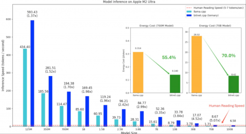 实现“不可能的任务”:测试表明,bitnet.cpp甚至可以在单个CPU上运行高达1000亿参数的BitNet模型,其速度足以达到人类的正常阅读水平(约每秒5-7个词元)。这在过去是无法想象的,它意味着未来极其强大的AI模型或许可以直接在用户的个人设备上本地运行。