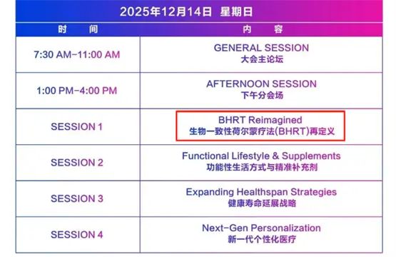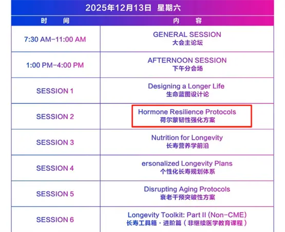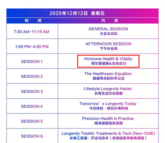 今年的年会日程同样精彩纷呈,从主论坛到分会场,涵盖长寿科学、精准医疗、生活方式干预等多元主题。而其中,荷尔蒙健康更是被多次提及,成为会议的核心议题之一。