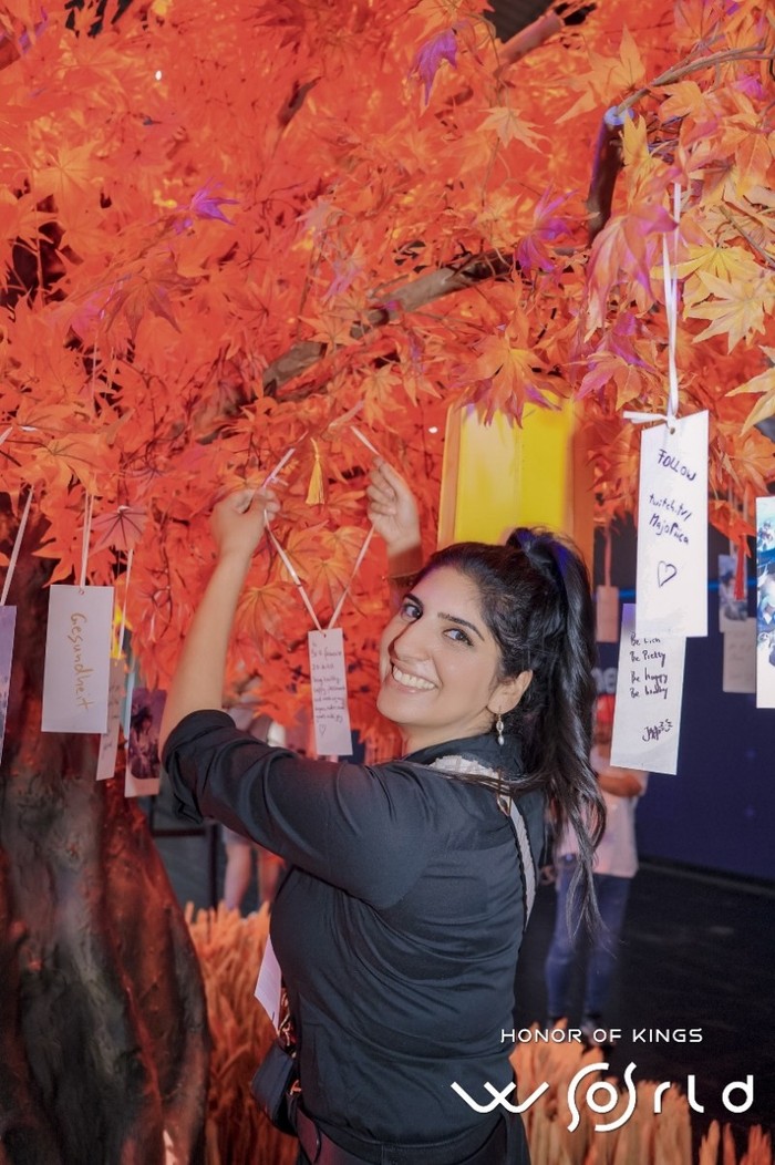 (海外玩家在《王者荣耀世界》展区“挂福签”许愿)