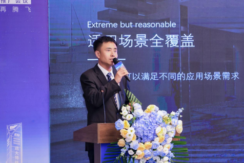 他重点介绍了卓悦系列客梯,强调其六大核心部件全部原厂原品牌,具备高安全、高兼容、高性价比的特性,速度范围覆盖1.0-10m/s,载重可达2500kg,土建利用率领先行业,智能化功能齐全,可广泛适配住宅、商用、医用等多类场景。