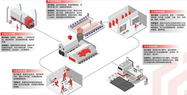 手册针对畜牧养殖的细分典型场景提供了商品与方案支持:在生物安全场景中,京东工业通过整合消毒液、防护用品等商品资源,并依托企配仓与厂直模式配送,实现全流程消杀与可视化管理;在养殖基地建设场景中,联合佛山照明推出照明优化方案,帮助养殖基地实现综合降本约30%;在自动化养殖生产线环节,联合ABB推出智能通风与控温解决方案,提高猪群健康水平,降低能耗与运维风险;在生活物资场景与检修维修场景中,京东工业通过电商化采购与托管模式,简化了繁杂的低值物资管理;在污水处理场景,则提供防腐泵、搅拌机等专业设备方案,满足高标准环保要求。