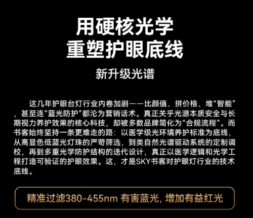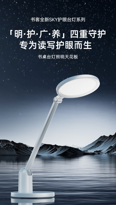 当前,我国青少年视力健康问题日益严峻,据国家卫检委最新统计数据显示,我国青少年近视率已高达52.3%。护眼台灯成为保护孩子眼睛的重要工具,针对市场上护眼台灯产品质量良莠不齐和高价低配的乱象,书客作为CCTV展播品牌和丁香医生团队推荐的专业光学品牌,以“重新定义护眼标准”为使命,全新推出SKY护眼台灯系列。其独创的「明·护·广·养」四维守护体系,首次将医学级光环境技术引入百元级产品: