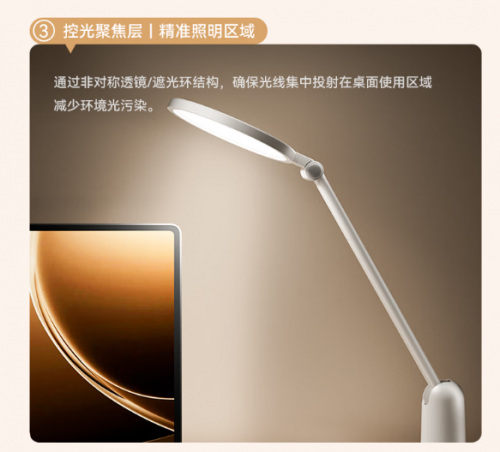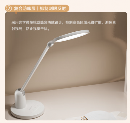 控光聚焦层:通过非对称透镜配合遮光环结构,确保光线集中投射在桌面使用区域,减少环境光污染。