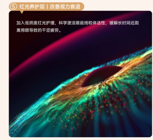 5、红光养护层:加入低照度红光护理,科学激活眼底线粒体活性,缓解长时间近距离用眼导致的干涩疲劳。