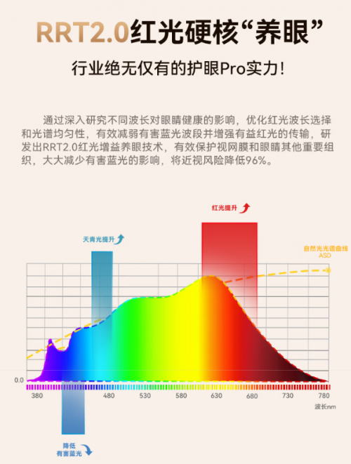基于《科学报告》期刊的“长波红光可以延缓近视发生,增加长波红光的含量激活氧化酶突破性”的研究结果,书客深入研究不同波长对眼睛健康的影响,通过优化红光波长选择和光谱均匀性,研发出了RRT2.0红光增益养眼技术,有效减弱有害蓝光波段并增强有益红光的传输,做到了有效保护视网膜和眼睛其他重要组织,将近视风险降低96%。