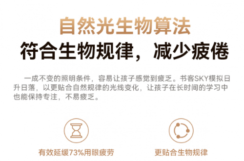书客SKY创新采用模拟日升日落的自然光生物算法,以贴合自然规律的动态光线变化模式,助力孩子在长时间学习过程中保持专注状态、减少疲惫感,有效延缓88%的用眼疲劳,为持续高效学习提供舒适的光环境支持。