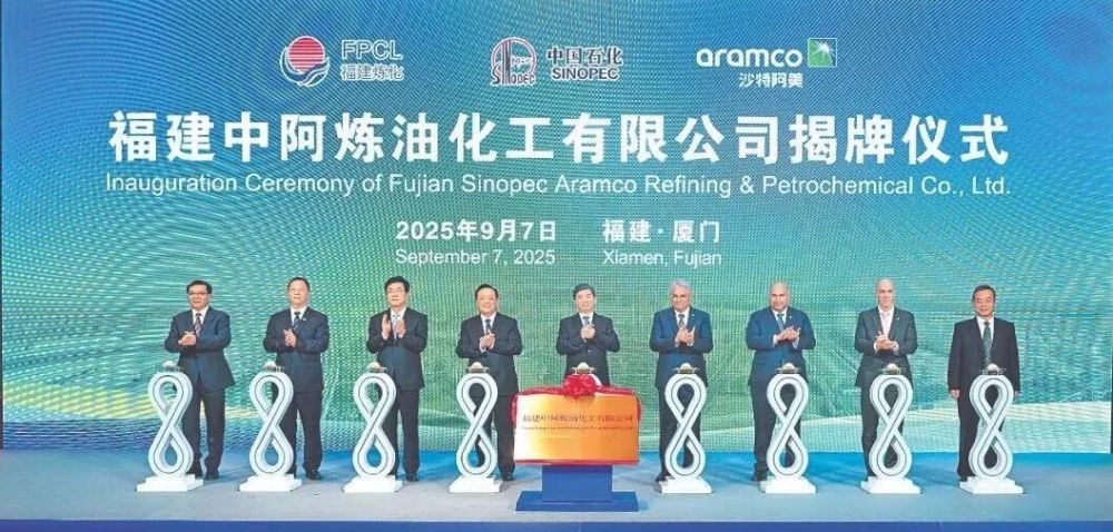 9月7日,福建中阿炼油化工有限公司揭牌仪式在厦门举行,中国石化集团公司党组书记、董事长侯启军,福建省委书记、省人大常委会主任周祖翼,福建省委副书记、省长赵龙,沙特阿美下游业务总裁穆罕默德·卡塔尼出席。