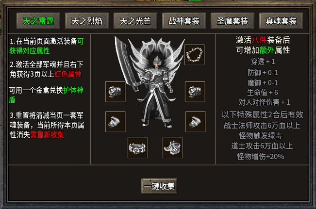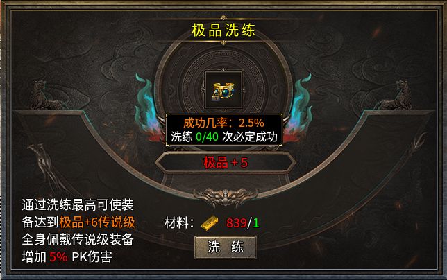 这些极品属性都能在刷怪过程中获取,另外也可以在极品洗练NPC处洗出最高极品+6的装备,如果全身佩戴传说级装备还能再增加5%的PK伤害。