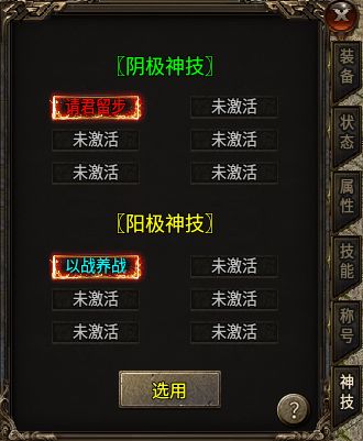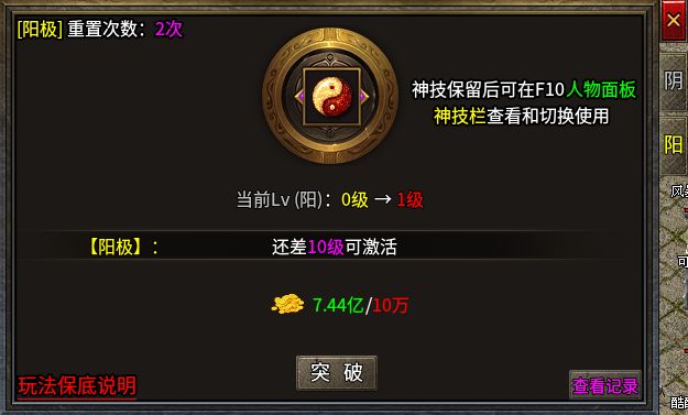 前面提到除了经典传奇的内容外,《开夏复古小极品》还创新地加入了中国传统文化元素。比如“太极两仪”和“阴阳神技”,在盟重省的NPC处可以通过提交金币来升级阴阳两种属性,人物等级越高,附加提升的属性也就越高,最高可以提升10级,之后还能随机激活一种神技技能。