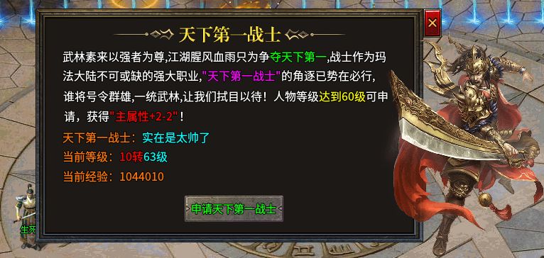 一个需要玩家前往“以武入道”NPC处提交金币提升武道境界,从最低阶的武徒、武者一路升到盟重省内的上限先天境界,达到特定境界后就可以进入“武道殿堂”。这里能进行四级技能修炼,并且强化技能,也能收集提交装备来激活图鉴属性,还能在生死台和其他玩家进行决斗等等。60级以上的角色还可以申请“天下第一”的称号,等等。